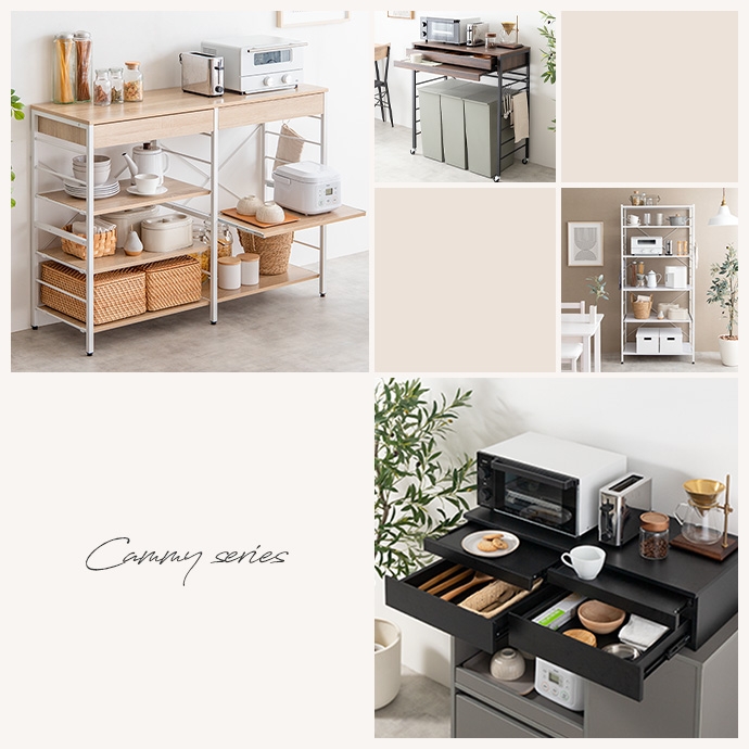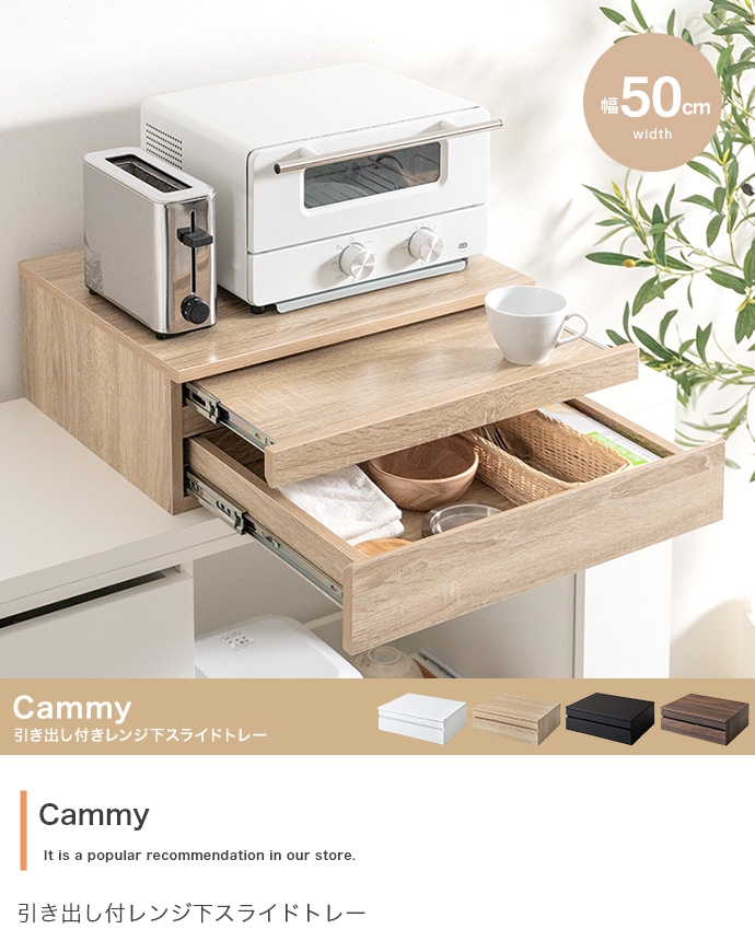 レンジ下を有効的に活用する『Cammy(キャミー)』レンジ下収納。 ちょい置きできるスライドトレーとワイドな引き出しで、手狭なキッチンをすっきり整理し快適にします。今の環境を大きく変えないまま、作業効率を大幅アップすることが可能です。