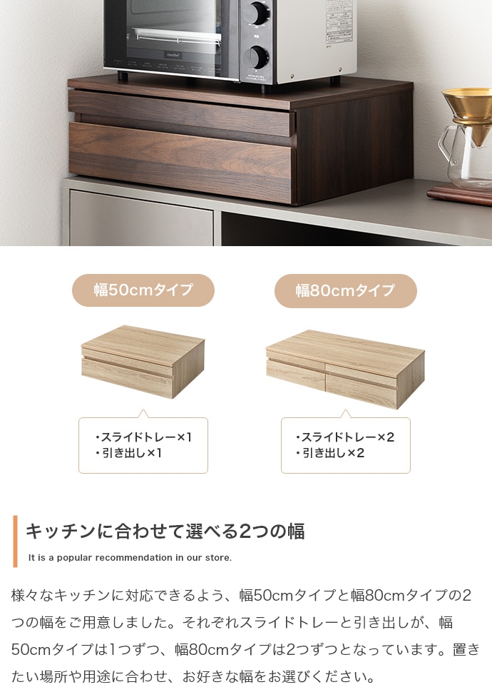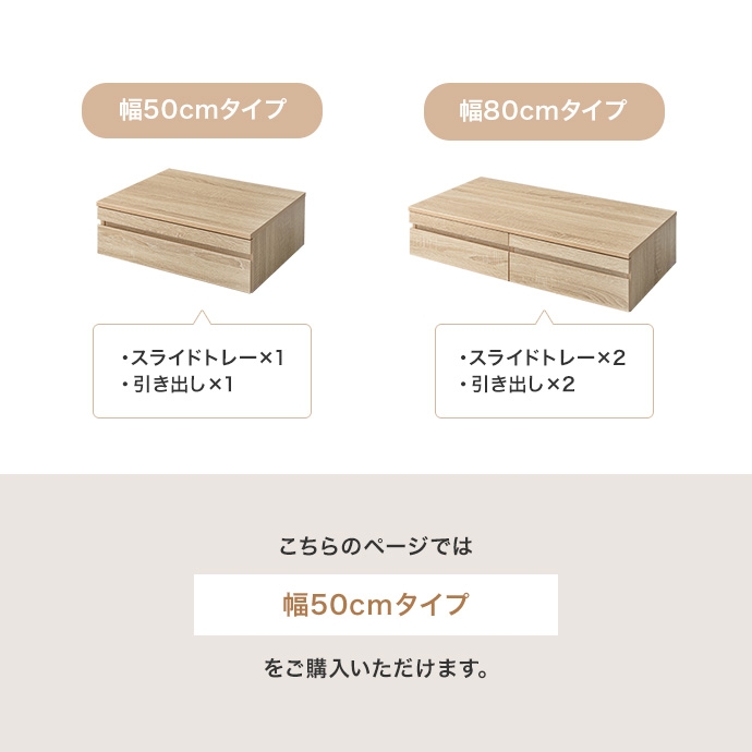 幅50cmタイプと幅80cmタイプの2つのサイズをご用意したため、置きたい場所や用途に合わせお好きな幅をお選びいただけます。