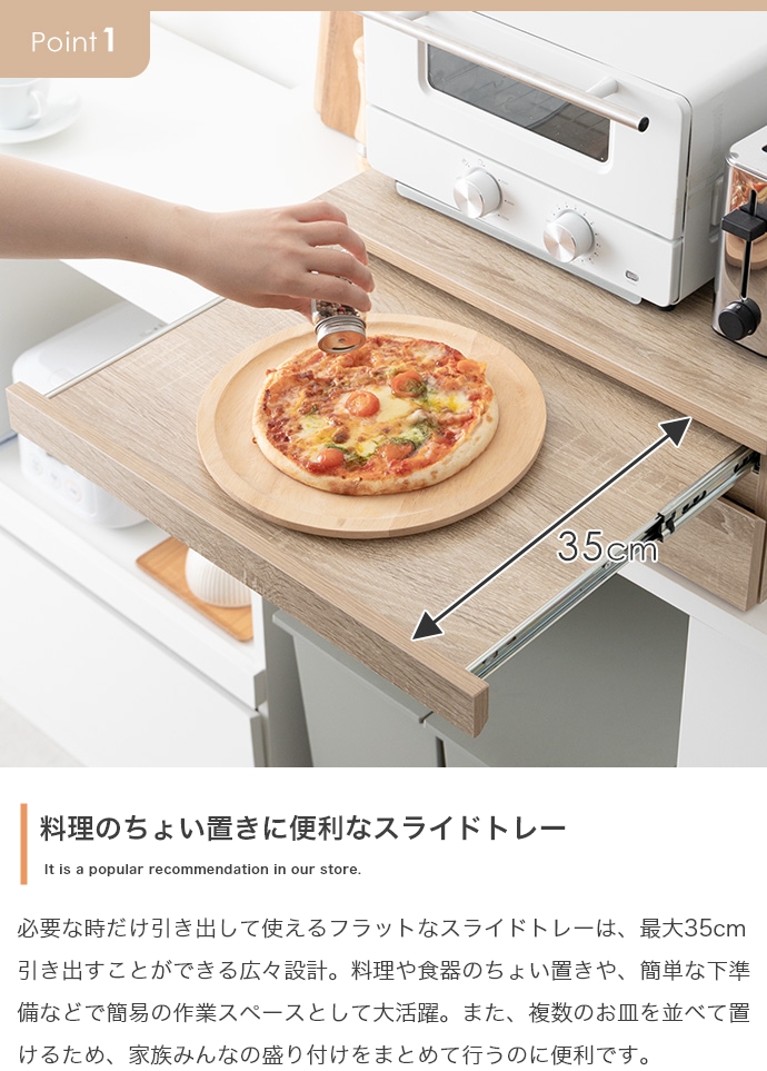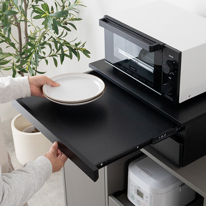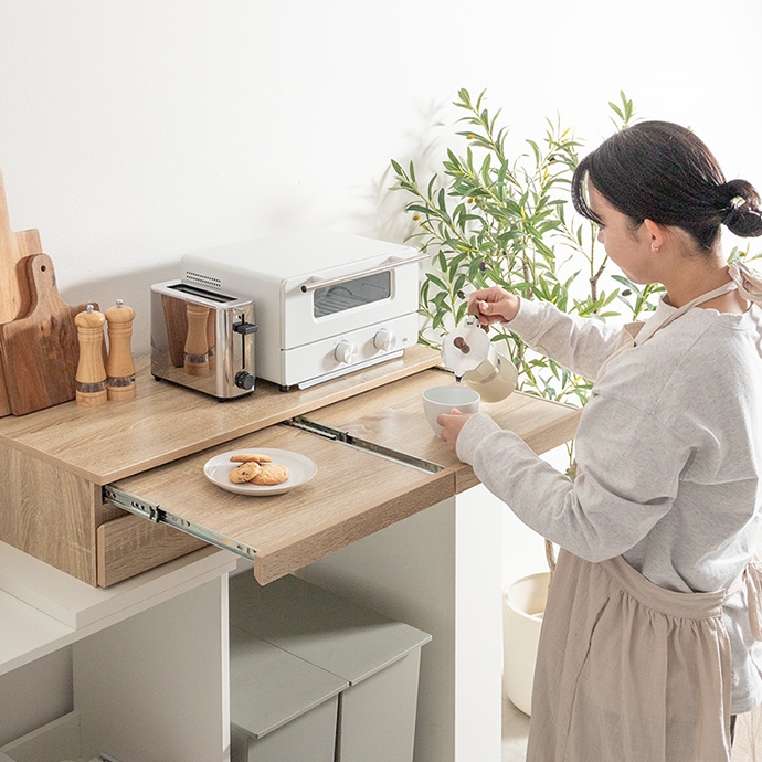 ちょい置きできるスライドトレーとワイドな引き出しで、手狭なキッチンをすっきり整理し快適にします。