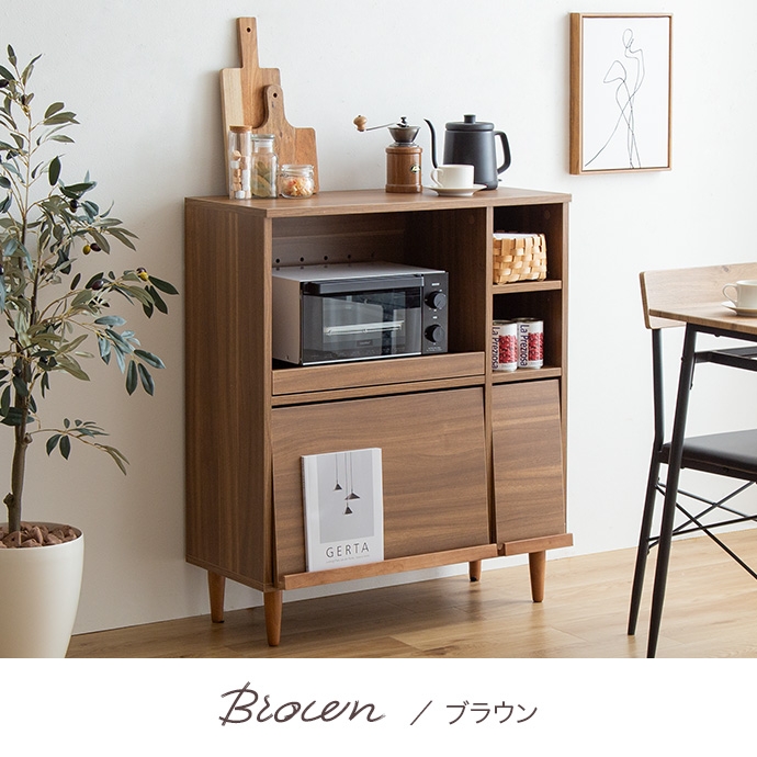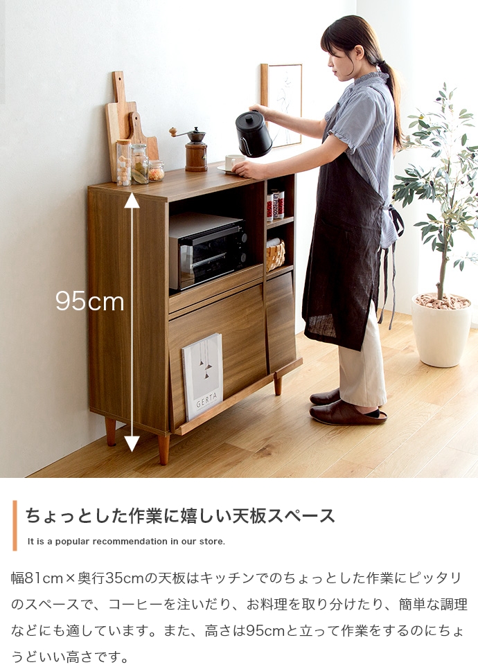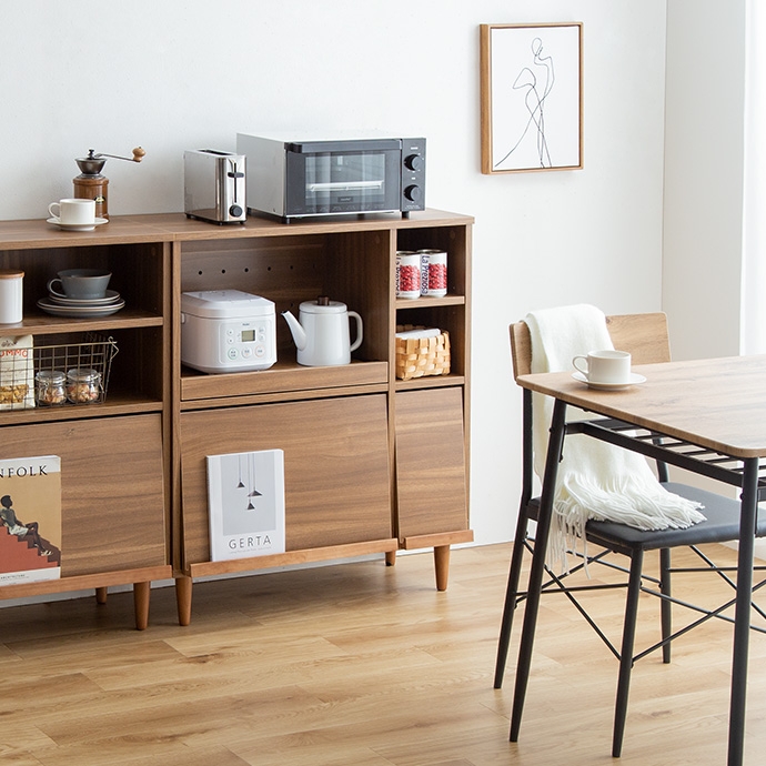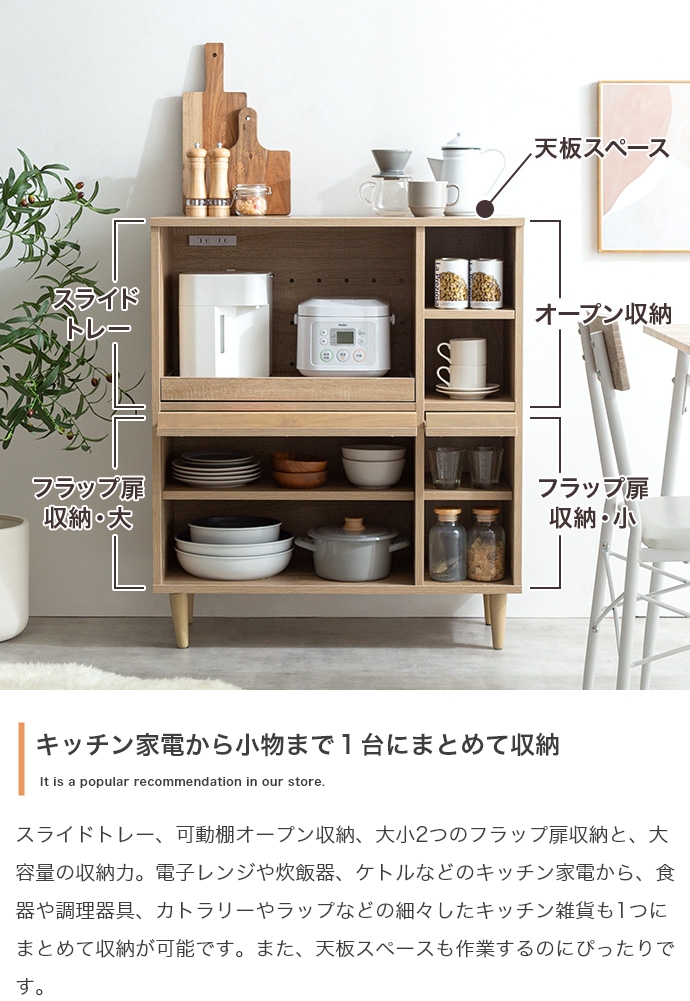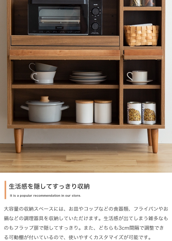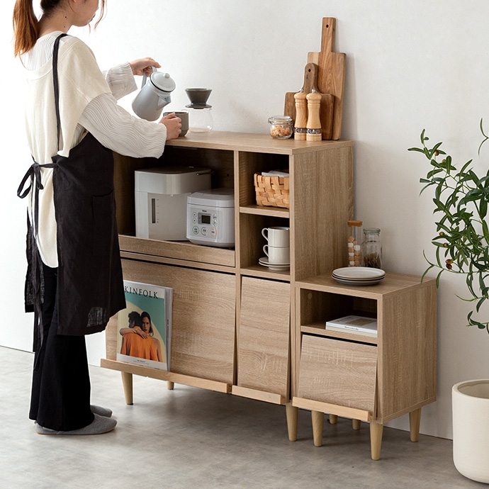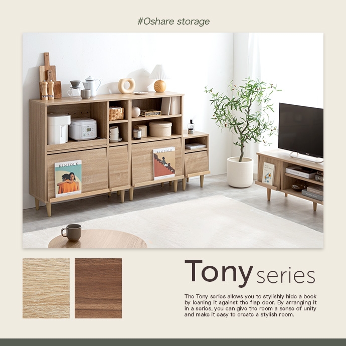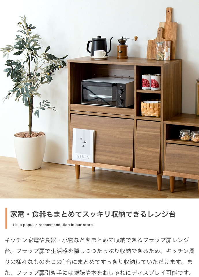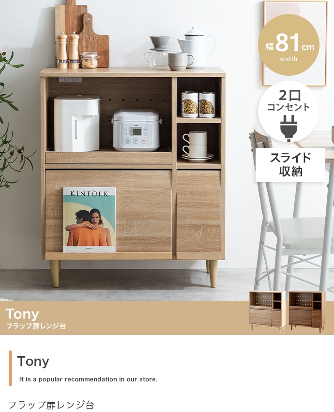フラップ扉で生活感を隠して、おしゃれに魅せる『Tony(トニー)』のレンジ台。 フラップ扉収納内に雑多なものを隠してキッチンをスッキリ片付けられ、コンパクトなサイズ感で作業台としてもお使いいただけます。