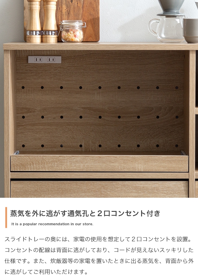 フタ付き家電・容器に最適なスライドトレー部分には、蒸気を逃がす通気口や便利な2口コンセントが付いています。
