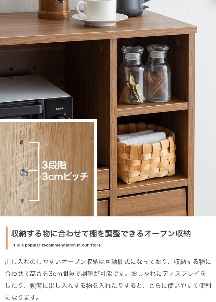 可動棚式のオープン収納や、食器やお鍋も入る下段収納を完備。場所を選ばず設置でき、作業台としても活躍します。