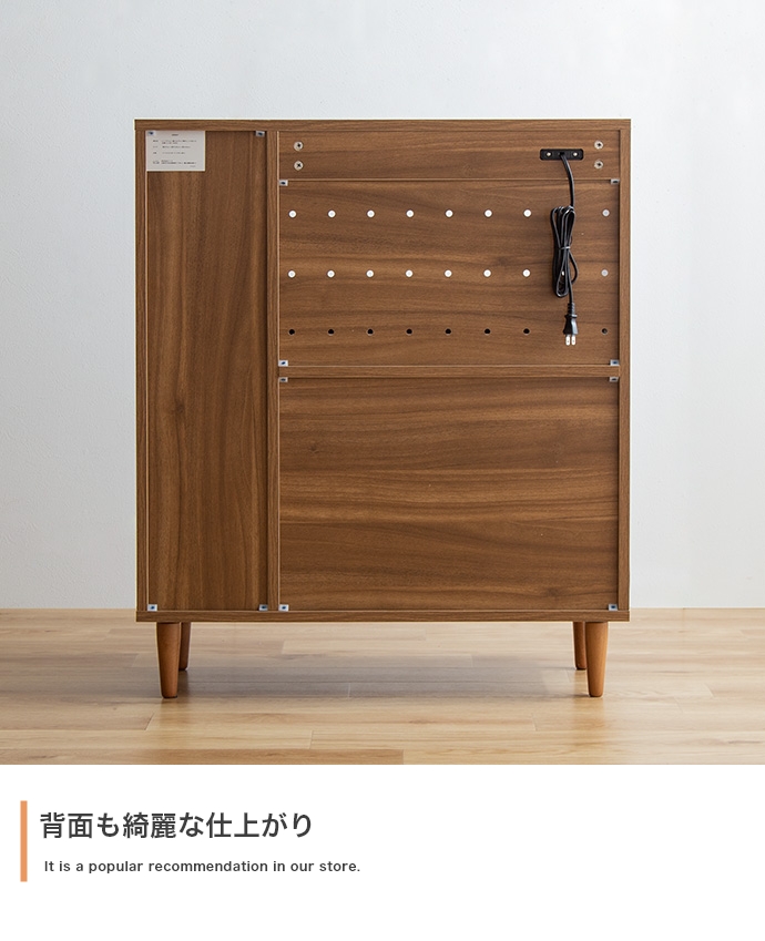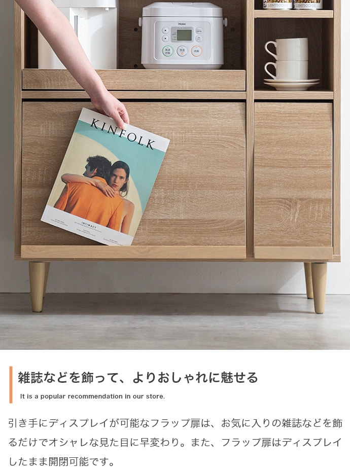 フラップ扉収納内に雑多なものを隠してスッキリ片付けられます。引き手には雑誌や本をおしゃれにディスプレイ可能です。
