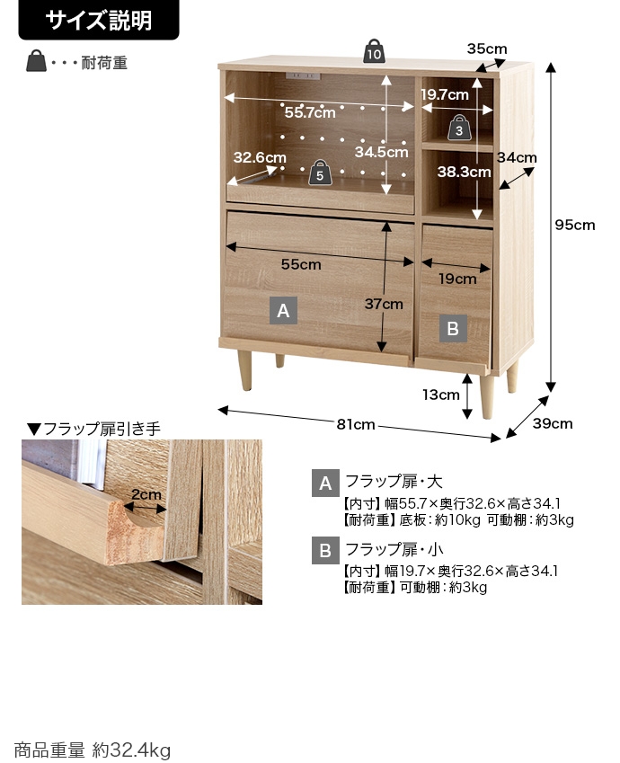 フラップ扉・大可動棚:約3kg、フラップ扉・大底板:約10kg、フラップ扉・小可動棚:約3kg |