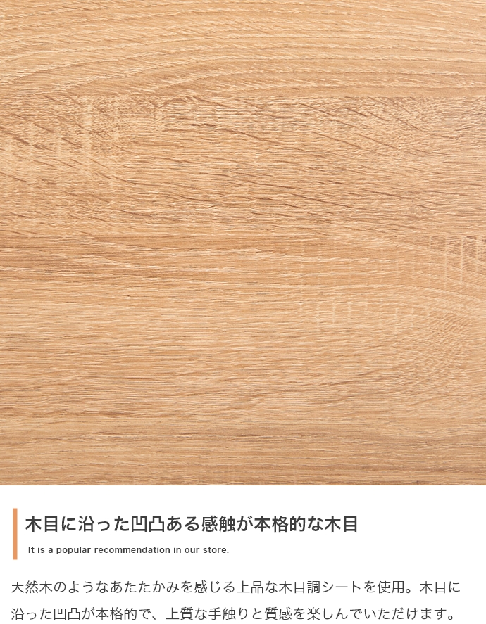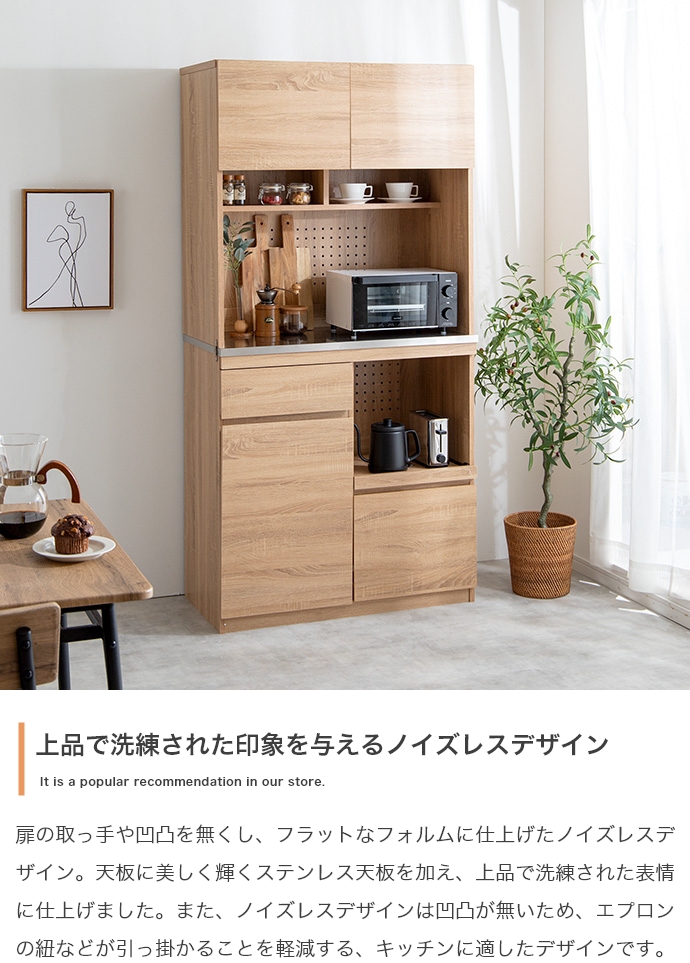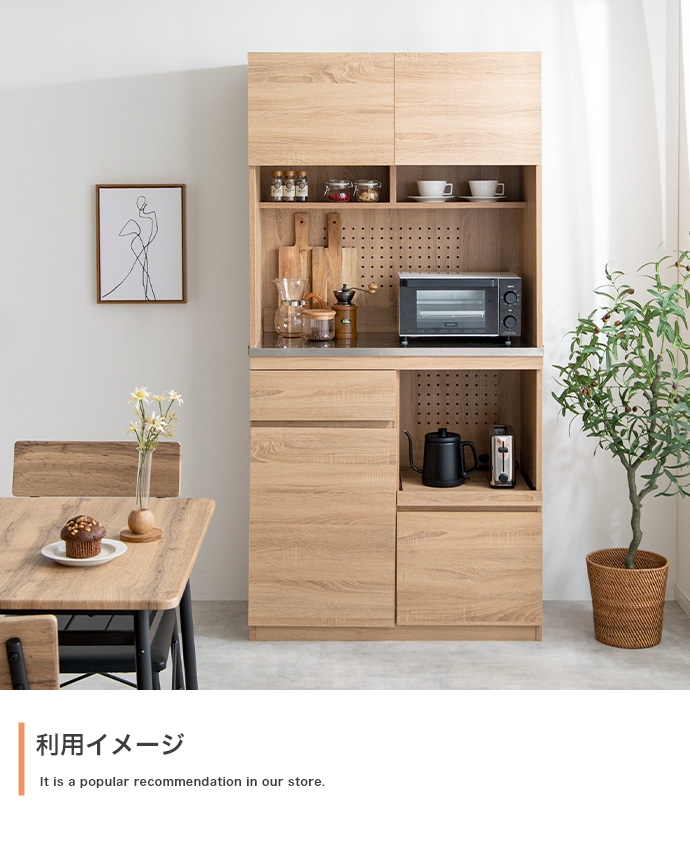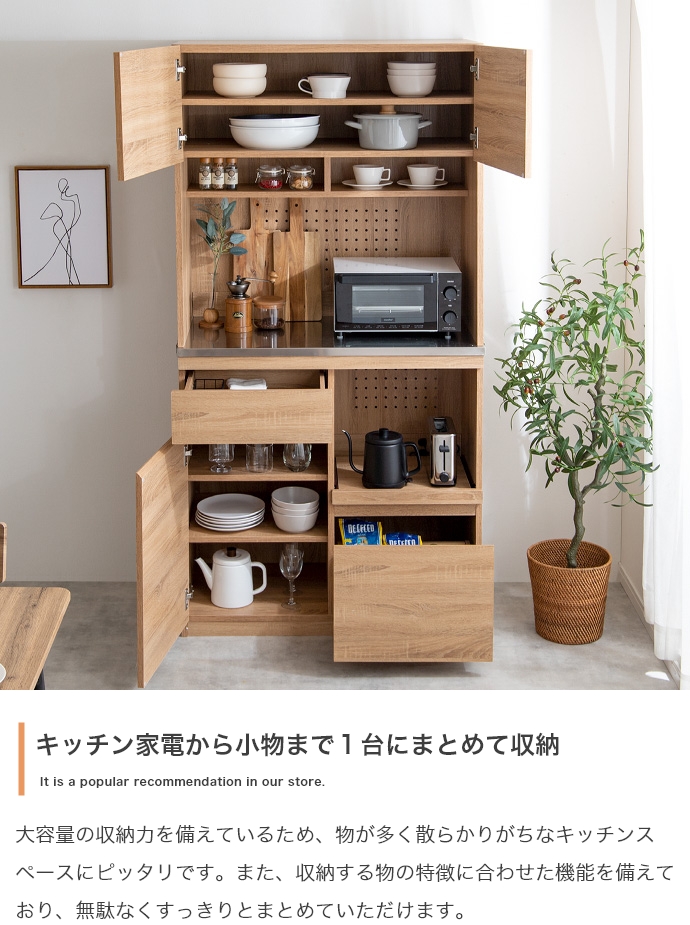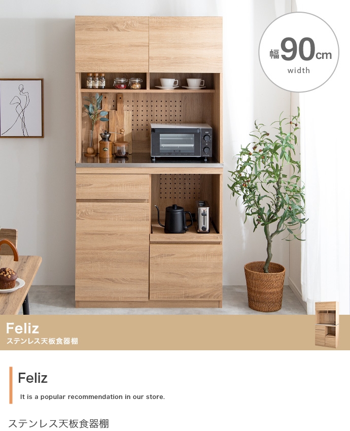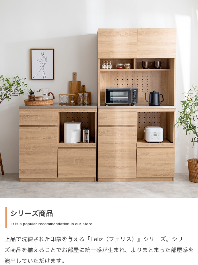 本格的な凹凸を感じられる木目と、機能性が高く美しいステンレスを掛け合わせた『Feliz(フェリス)』シリーズの食器棚。 水や汚れに強くお手入れが簡単なステンレス天板と、快適に使えるスライドトレーを採用し、キッチン作業をサポートします。