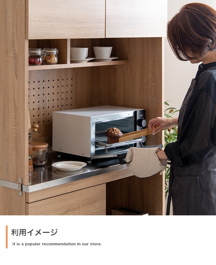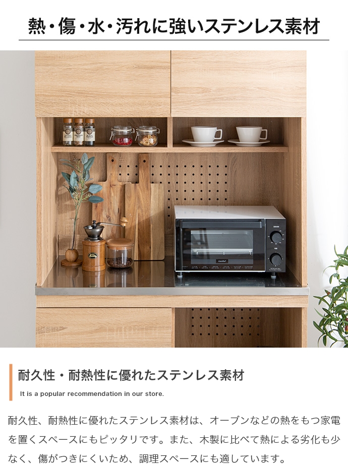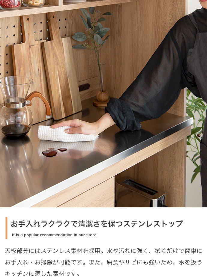 耐久性・耐熱性に優れたステンレス素材を天板部分に使用。水や汚れに強くお手入れが簡単で、食品を扱うキッチンにピッタリです。