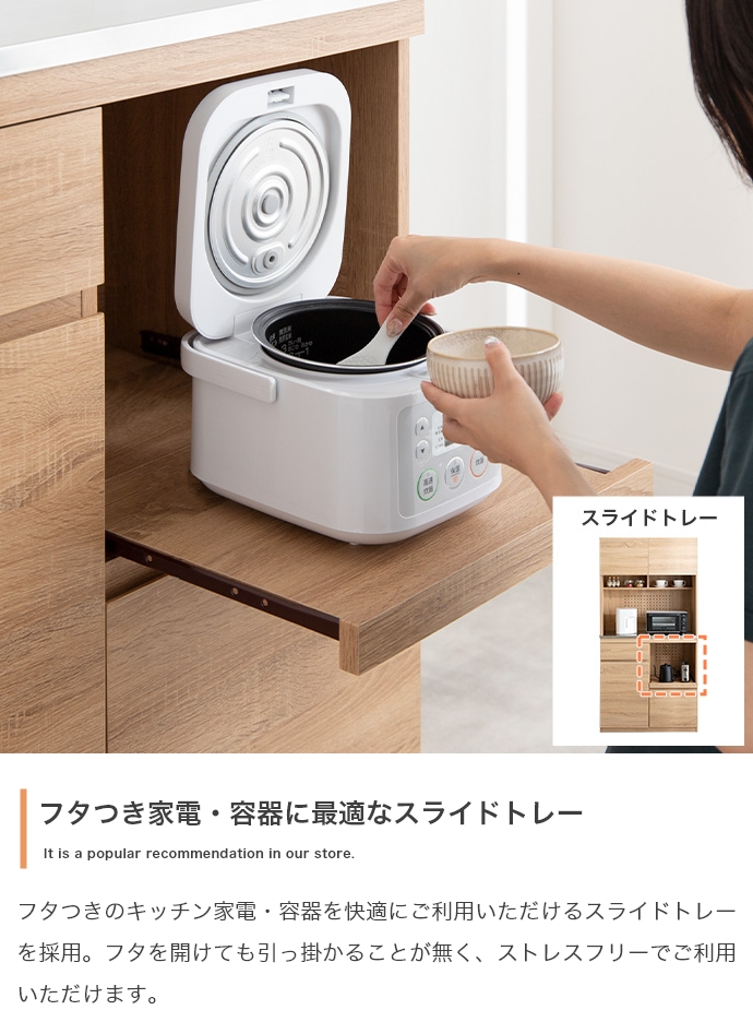 スライドトレーを採用しており、フタつきの家電や容器もストレスフリーで開閉でき、快適にご利用いただけます。