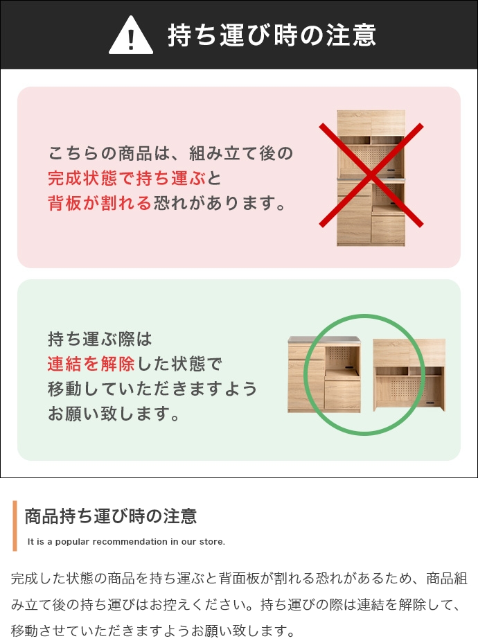 ※こちらの商品は、組み立て後の完成状態で持ち運ぶと背板が割れる恐れがあります。持ち運ぶ際は、上下の連結を解除した状態での移動をお願いいたします。 |
