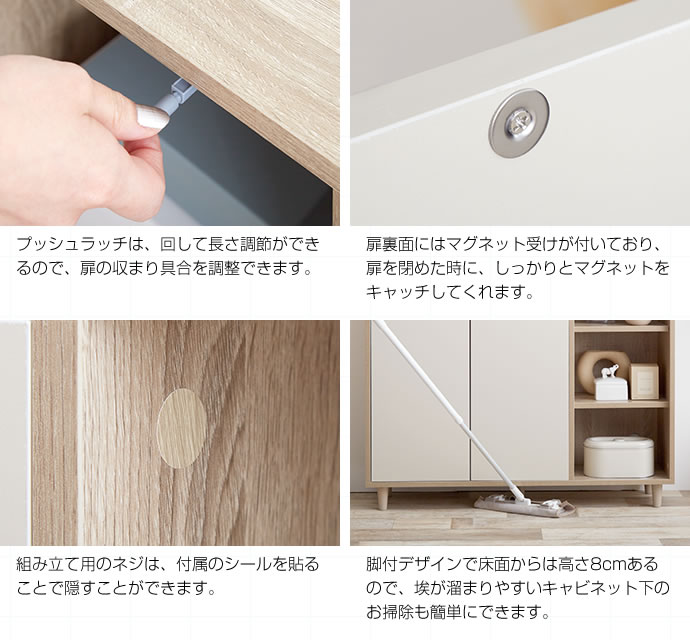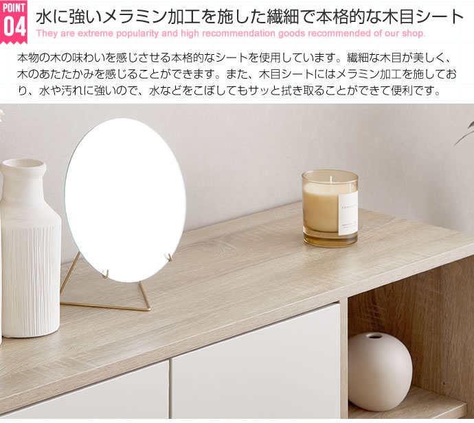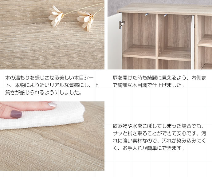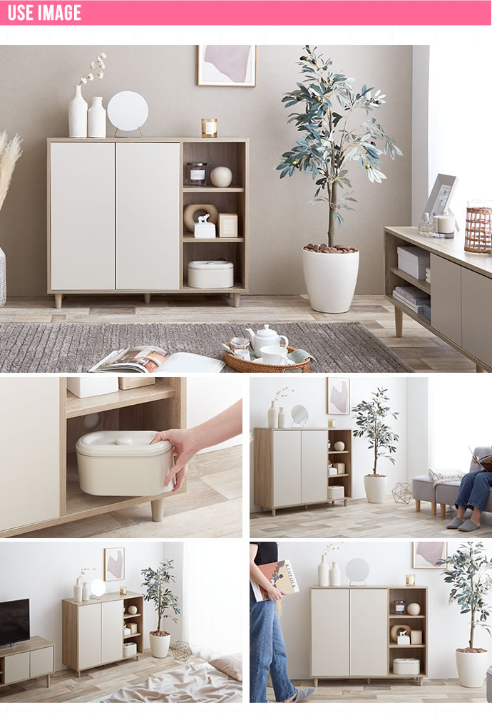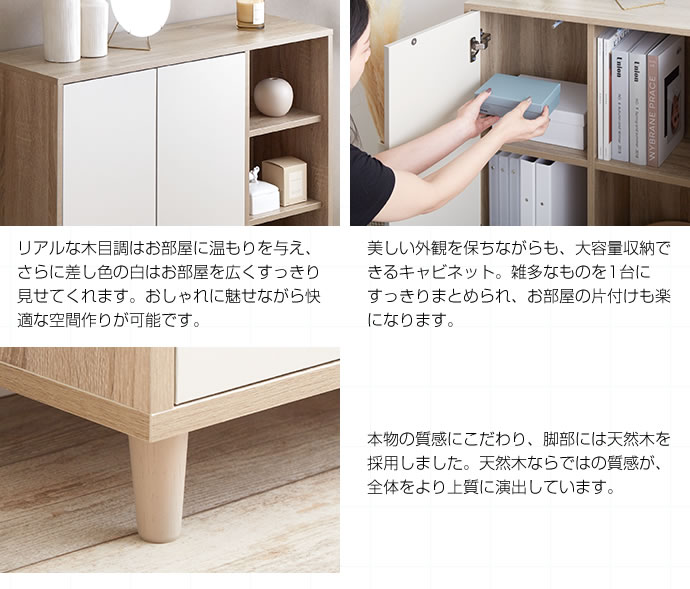 柔らかい木目調シートのナチュラルと明るいホワイトから成るバイカラーがおしゃれな『Erin(エリン)』シリーズのキャビネット。 お部屋に温かみと明るさをプラスし、洗練された空間を演出します。