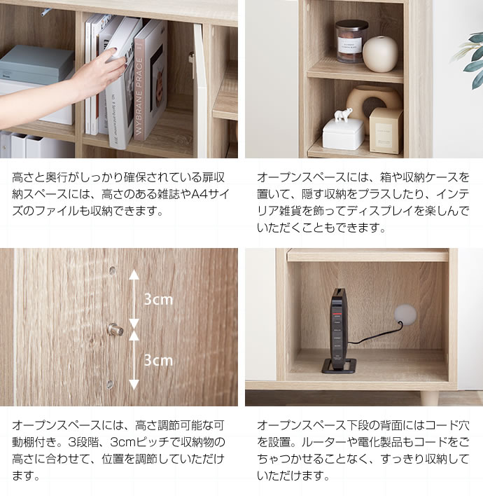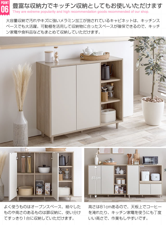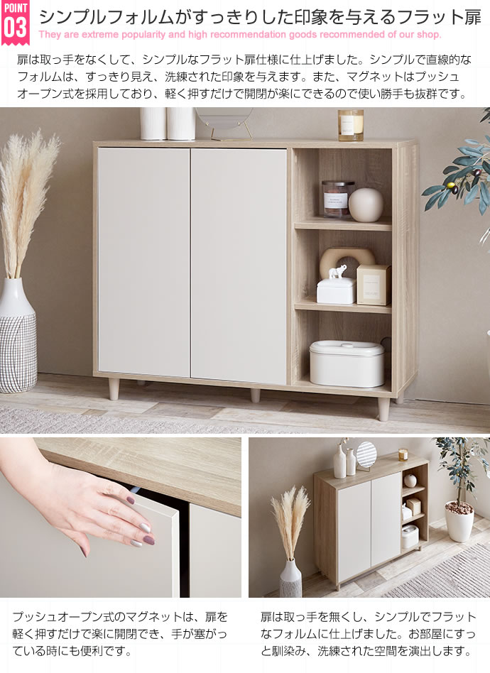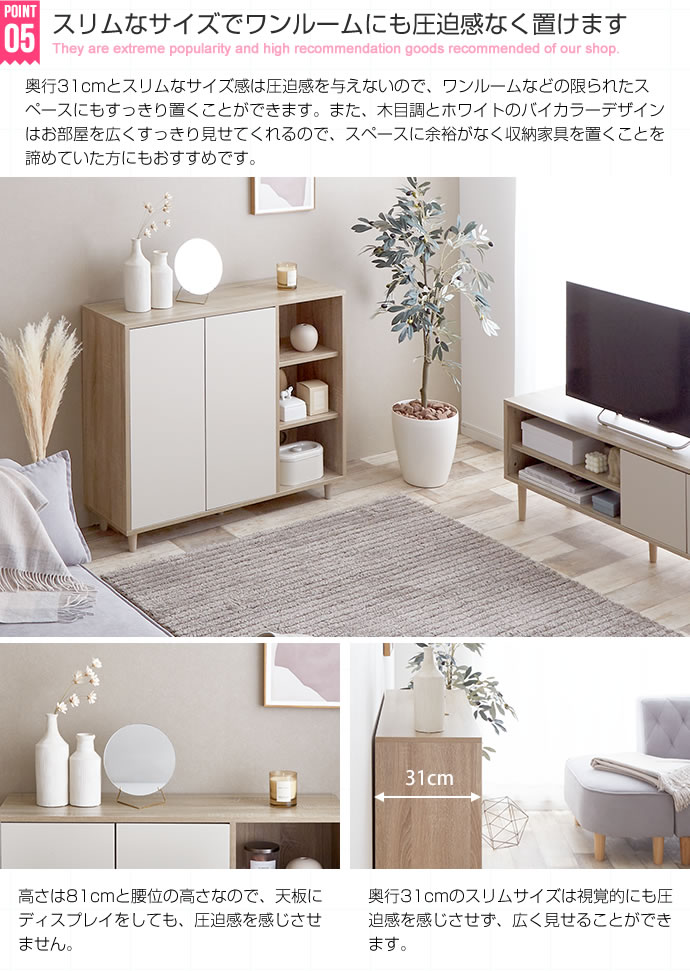 リビングやワンルームなど様々な場所に配置しやすい幅96cmサイズ。デザイン性と収納力を兼ね備えています。