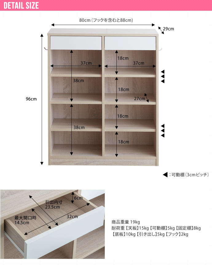 底板:約10kg、引き出し:約5kg、フック:約2kg |