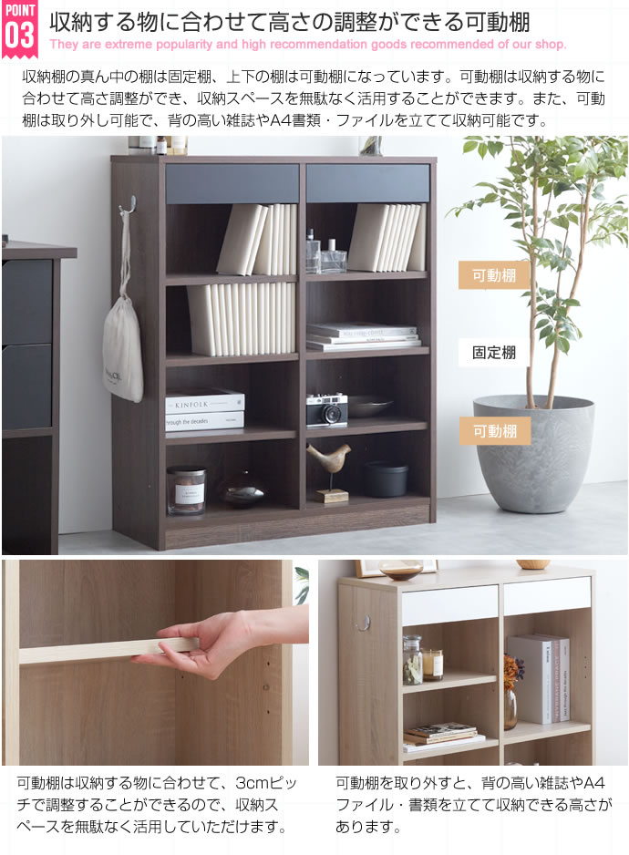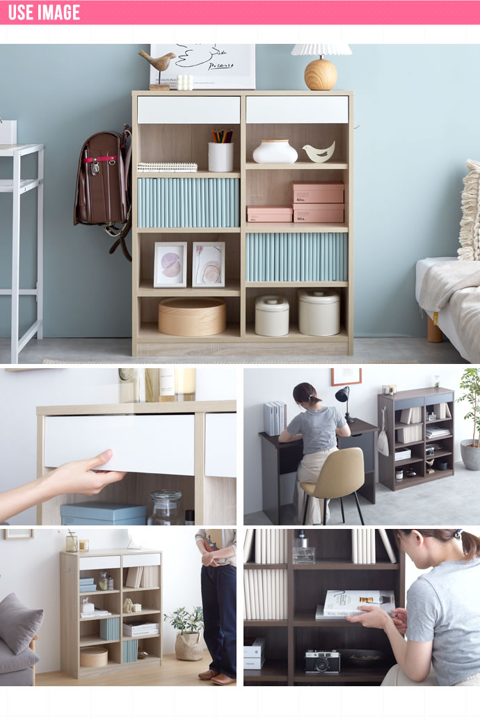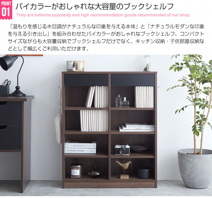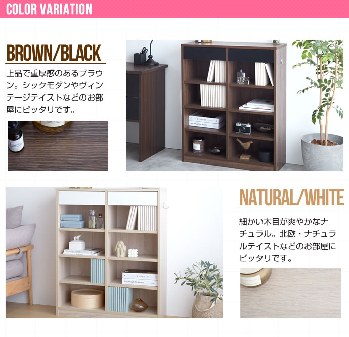 バイカラーがアクセントの『Curro』引き出し付き本棚。 本棚としてはもちろん、雑貨やインテリアを飾るディスプレイラックとして、またキッチン小物や食器を入れる収納としてもマルチに活躍します。