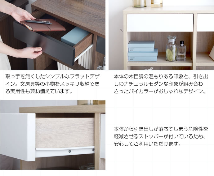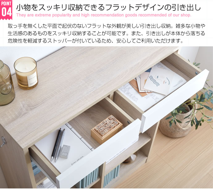 引き出しが付いているため、見せたくない小物類もすっきりと整理整頓できます。