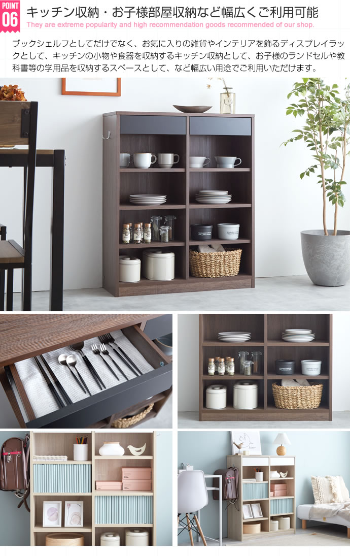 本棚としてだけでなく、雑貨を飾るディスプレイラックとしてもOK。キッチン小物や食器を収納する食器棚としてもお使いいただけます。