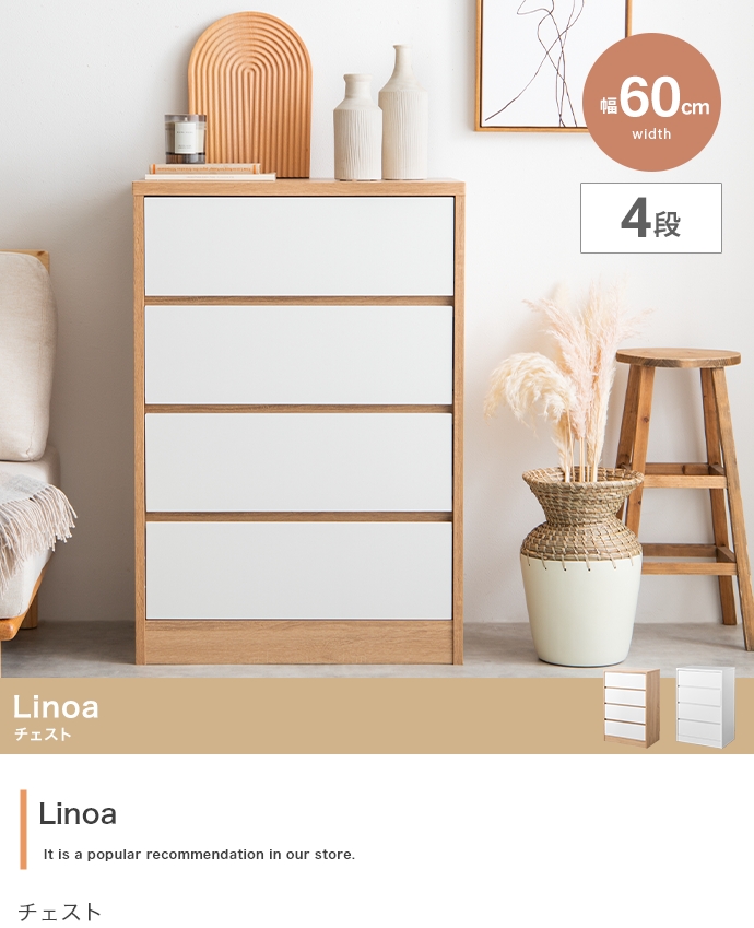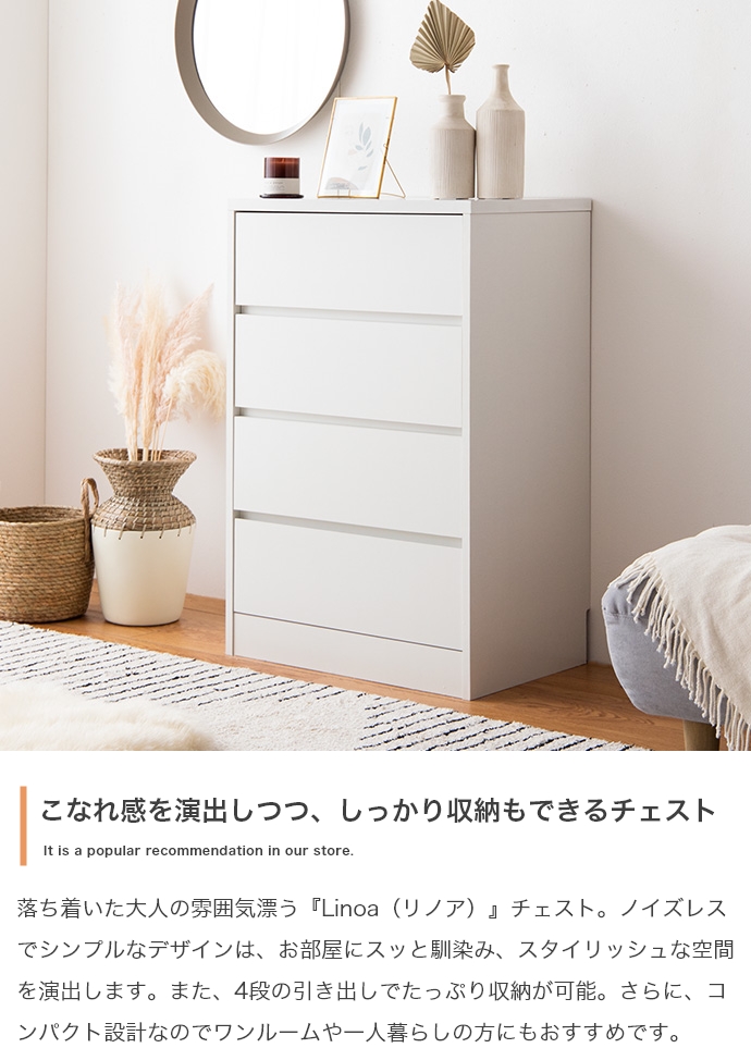 落ち着いた印象を与えながらお部屋にスッと馴染む『Linoa(リノア)』シリーズのハイタイプチェスト。 ノイズレスでシンプルなデザインは、お部屋にすっきりとした印象を与えます。コンパクトなのに収納力も抜群で、オールシーズンの衣類をまとめて収納可能です。