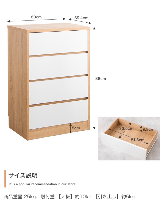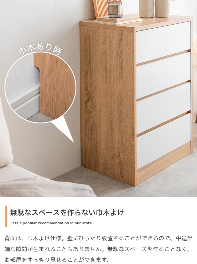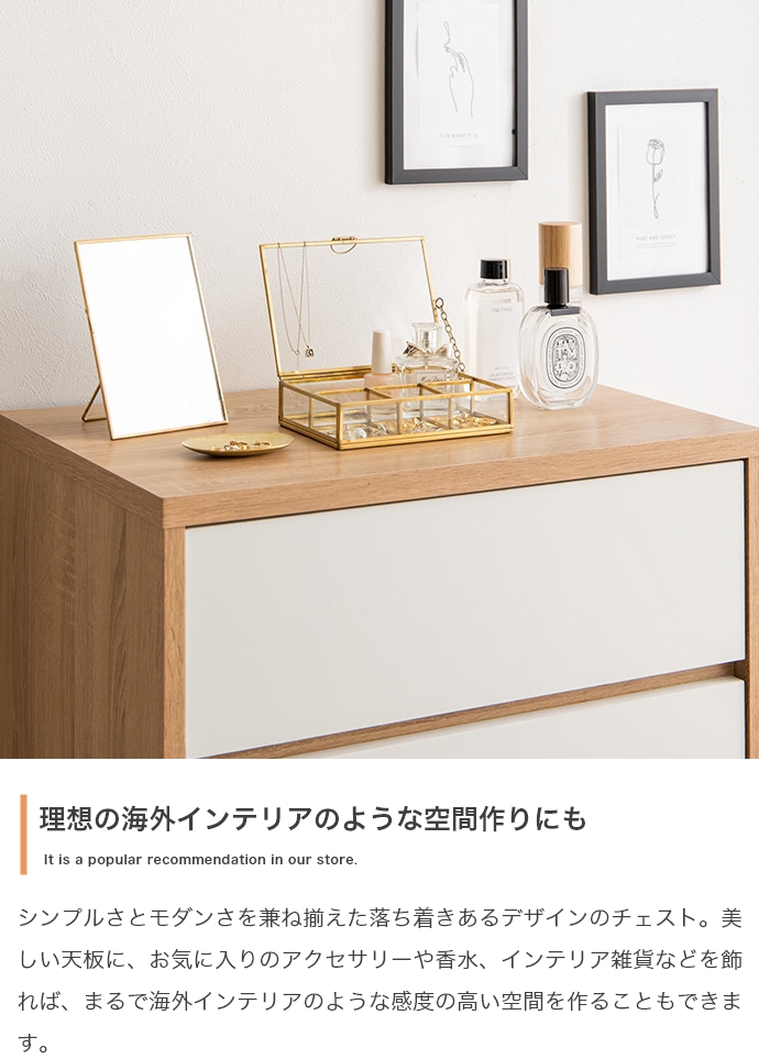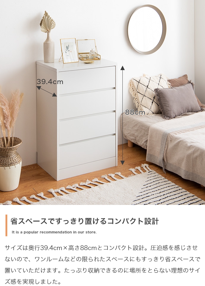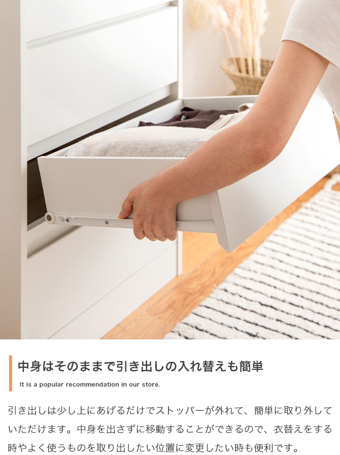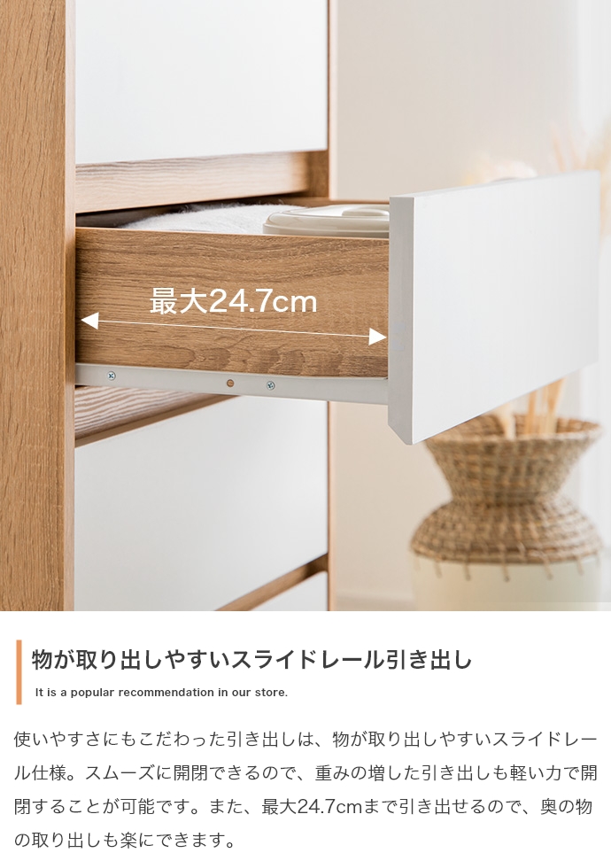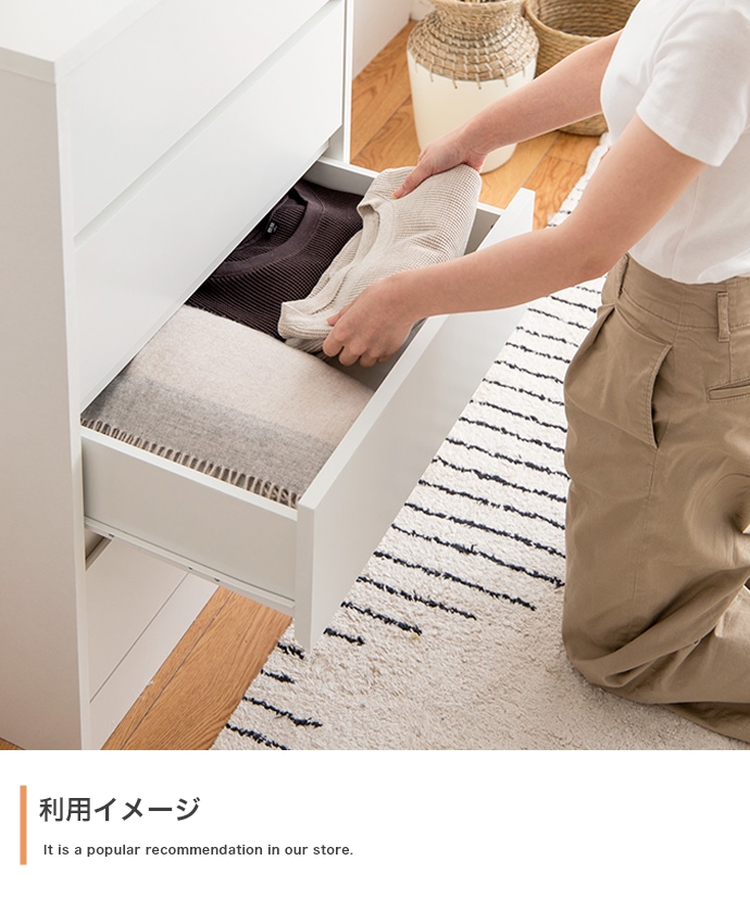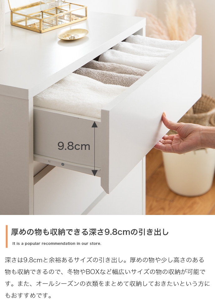 コンパクトなのに収納力も抜群。引き出しの深さもしっかりあるので、厚手の物や高さのある物、オールシーズンの衣類をまとめて収納できます。