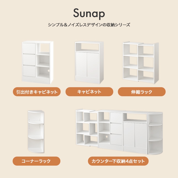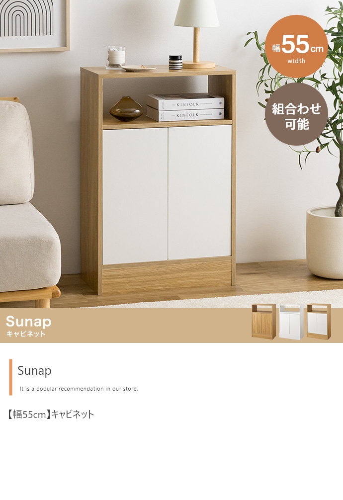 収納物に合わせて、隠す収納と見せる収納ができる『Sunap』シリーズのキャビネット。 シンプルでノイズレスなデザインは様々な空間と相性抜群。スリム設計ながら扉とオープンの2タイプの収納を備え、たっぷり収納していただけます。