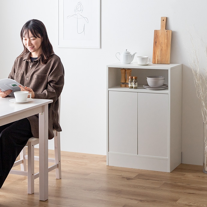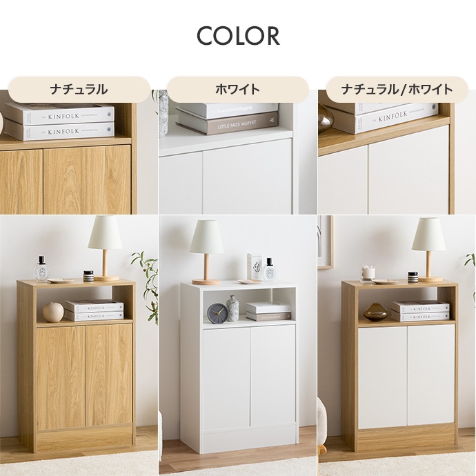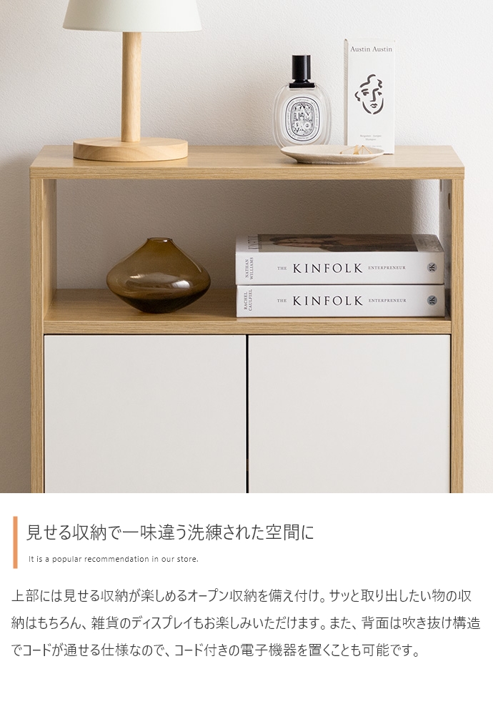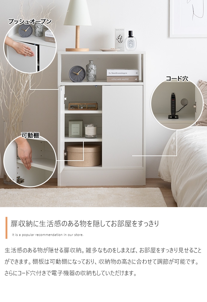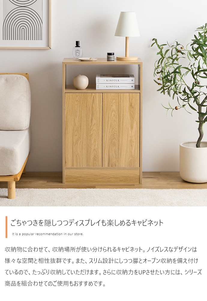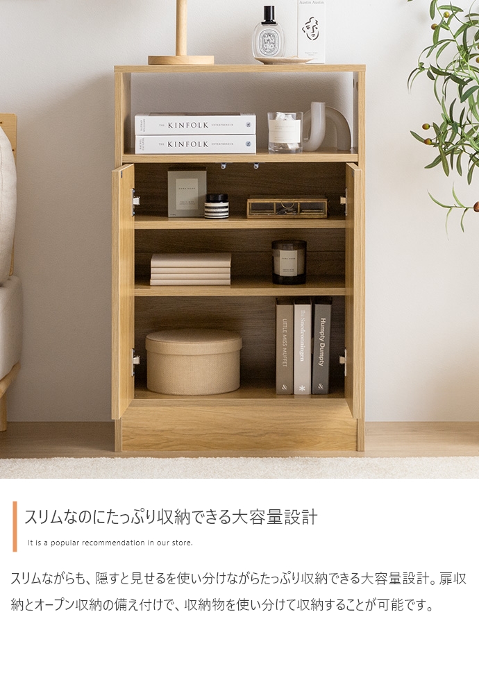 スリム設計ながら扉収納とオープン収納の2タイプを備えているため、収納物に合わせて「隠す収納」と「見せる収納」を使い分けられます。