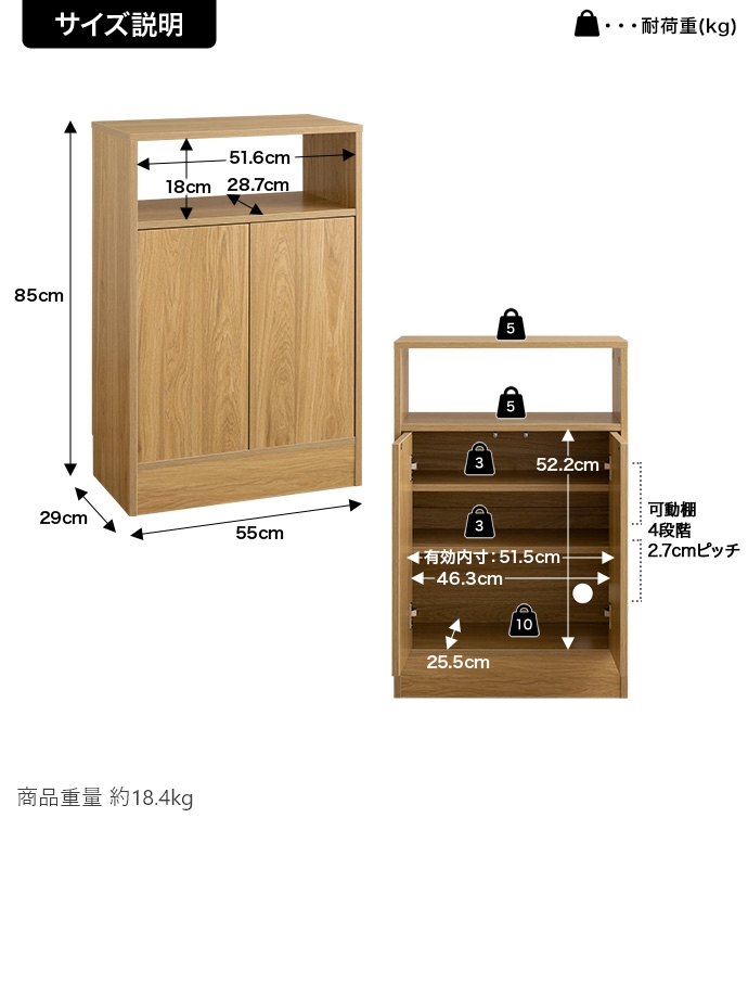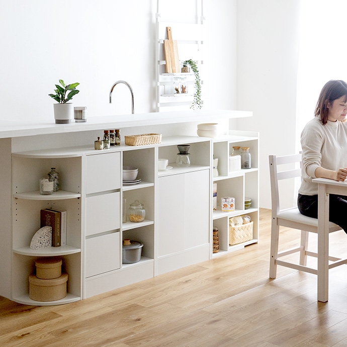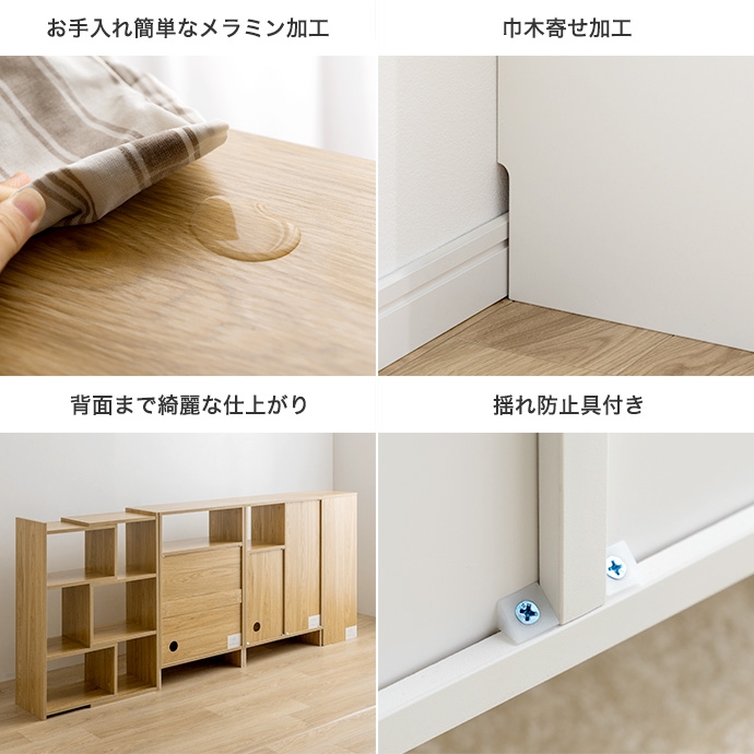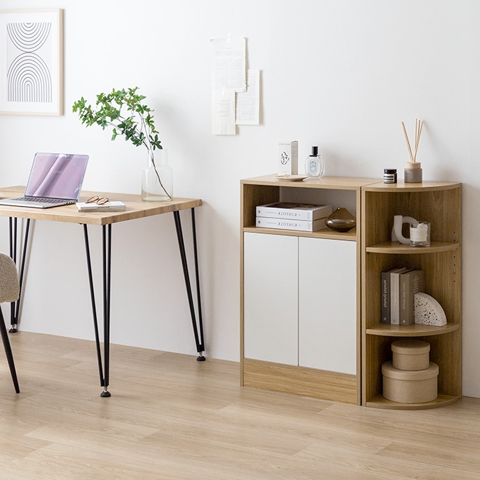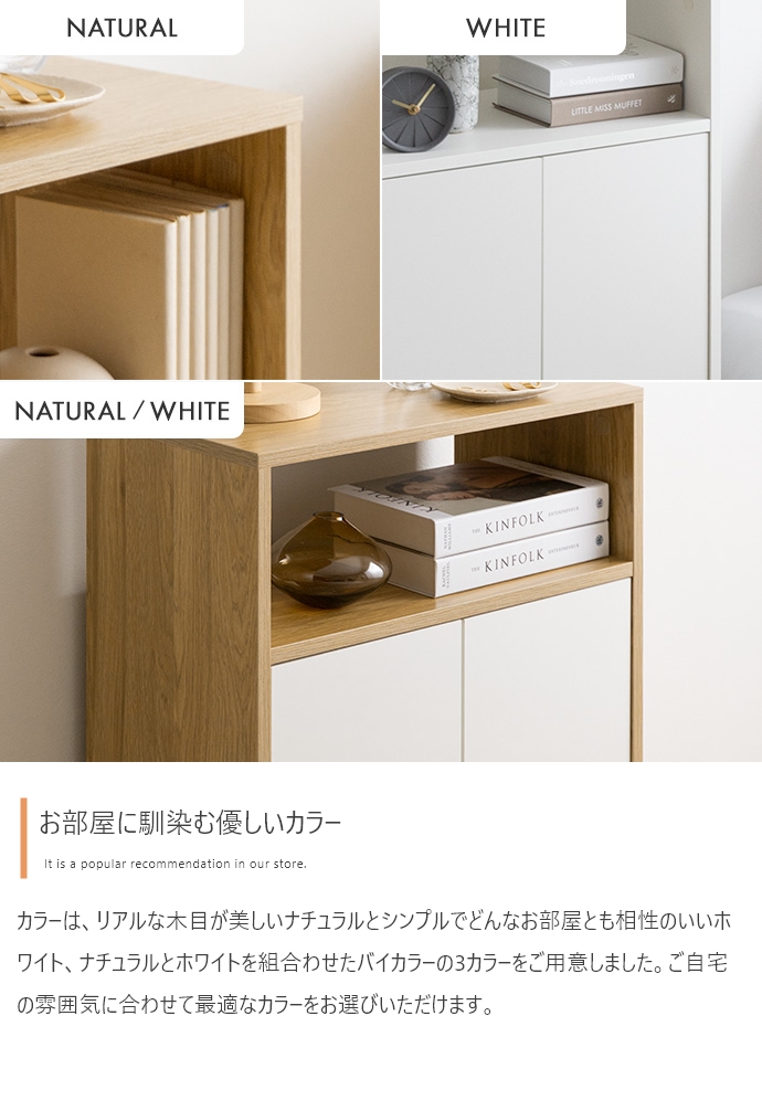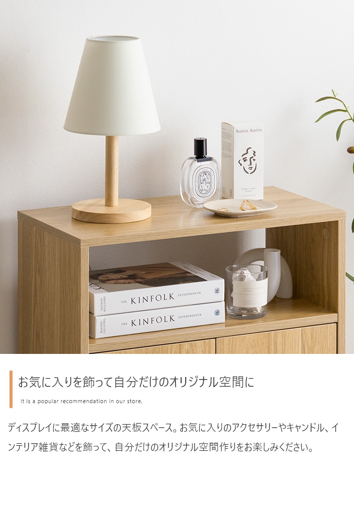 スリム設計ながら扉収納とオープン収納の2タイプを備えているため、収納物に合わせて「隠す収納」と「見せる収納」を使い分けられます。