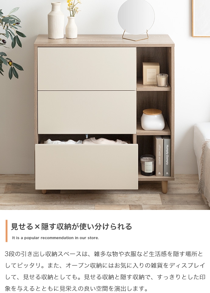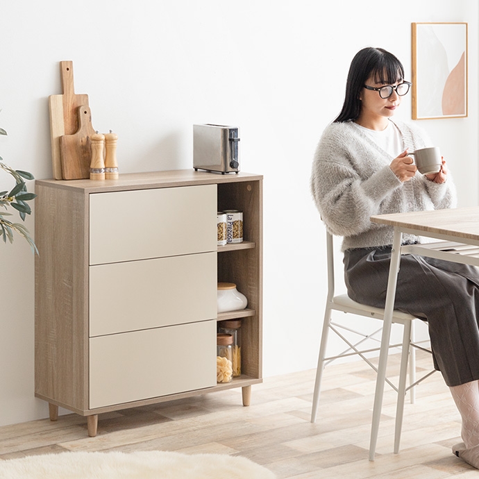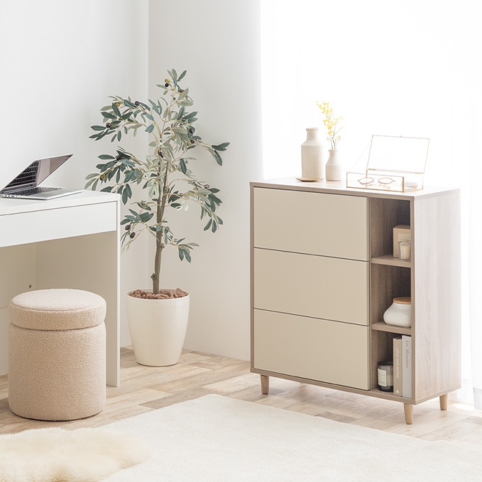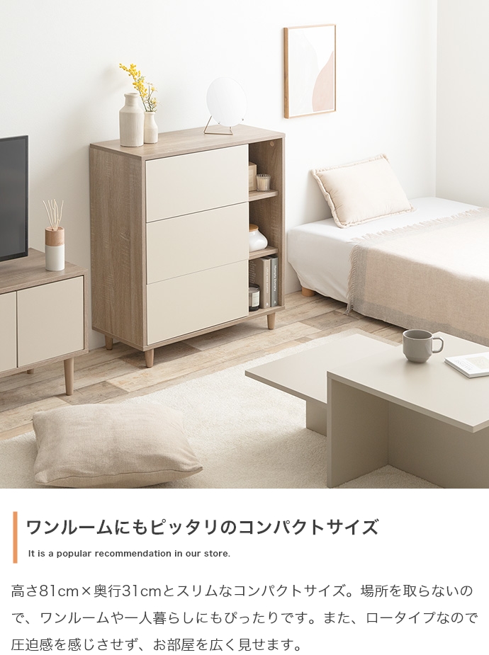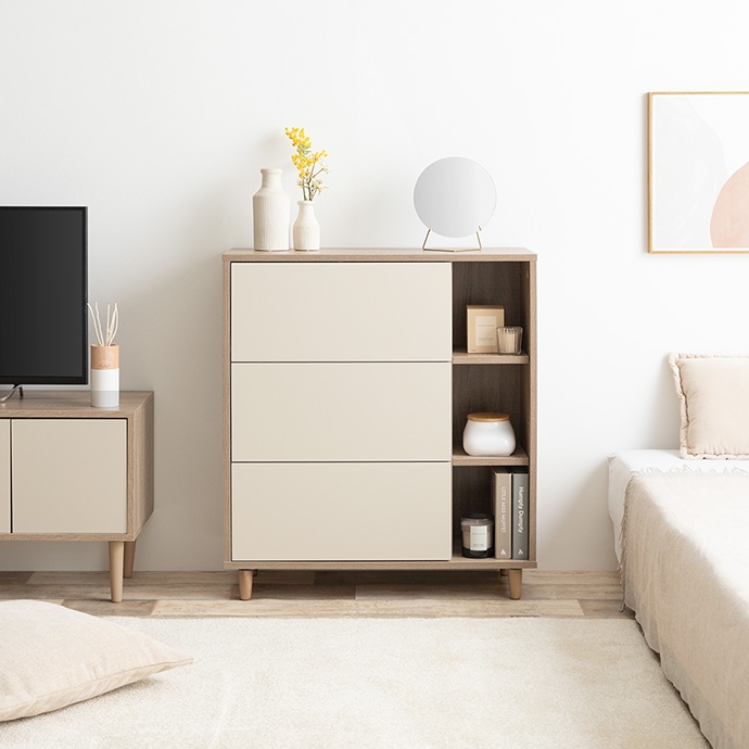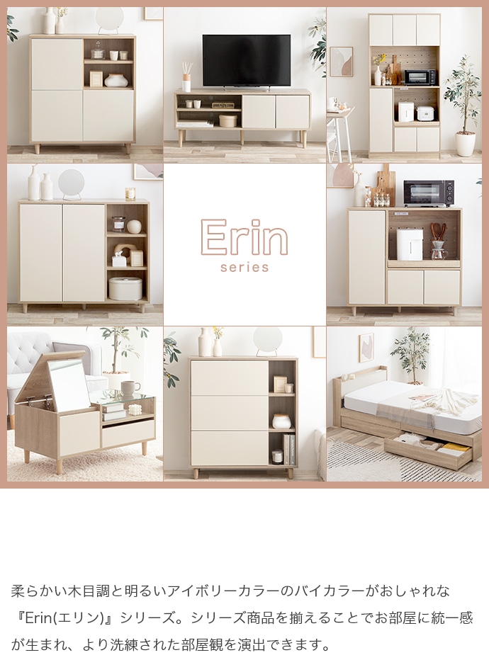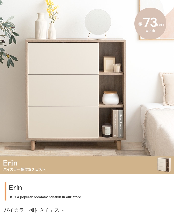 美しい木目調×アイボリーのバイカラーが特徴の『Erin(エリン)』シリーズのバイカラー棚付きチェスト。 天然木のような木目柄とアイボリーの組み合わせが、ナチュラルでありながらモダンな印象を与えてくれます。ワンルームにぴったりのコンパクトサイズでありながらも、充実した収納スペースを備えています。