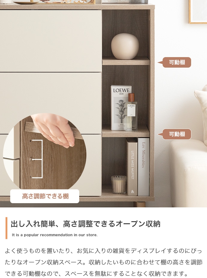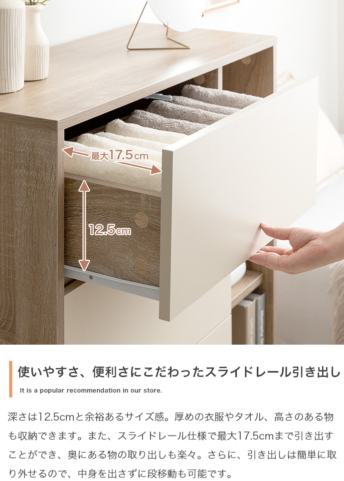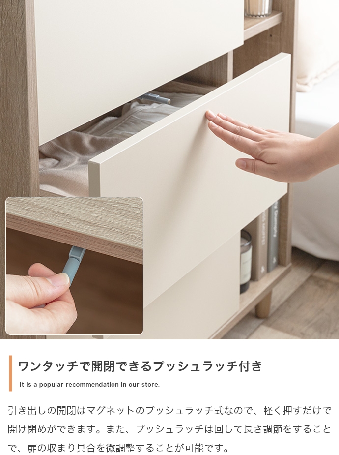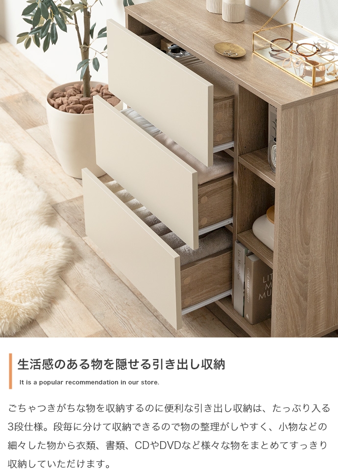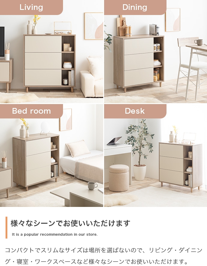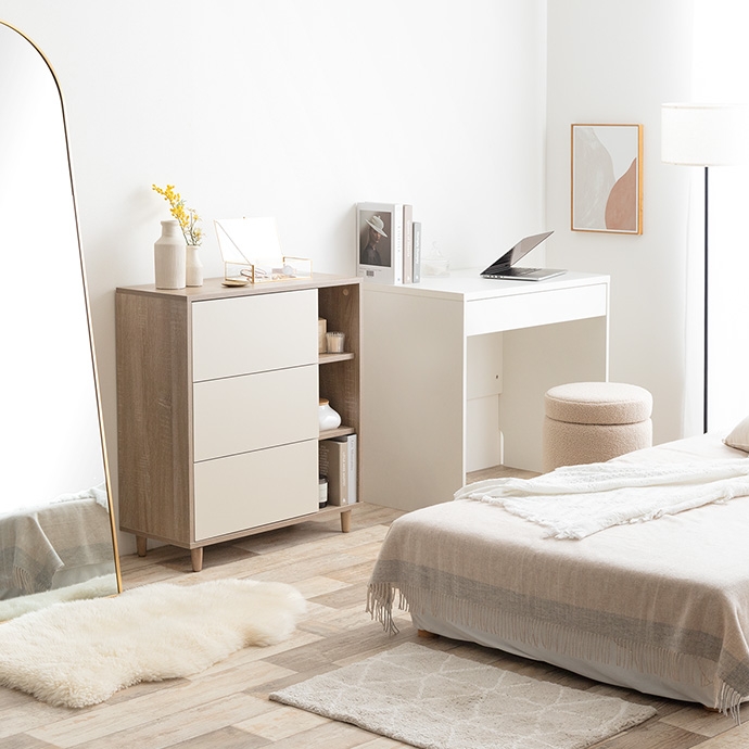 美しい木目調×アイボリーのバイカラーが特徴の『Erin(エリン)』シリーズのバイカラー棚付きチェスト。 天然木のような木目柄とアイボリーの組み合わせが、ナチュラルでありながらモダンな印象を与えてくれます。ワンルームにぴったりのコンパクトサイズでありながらも、充実した収納スペースを備えています。