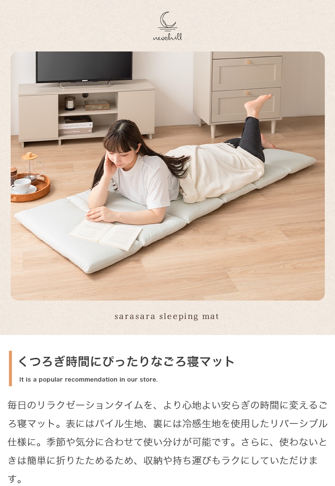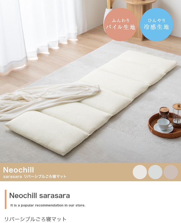 毎日のリラクゼーションタイムを、より心地よい安らぎの時間に変える『Neochill(ネオチル)』シリーズのsarasaraごろ寝マット。 表にはパイル生地、裏には冷感生地を使用したリバーシブル仕様。使わないときは折りたたんでコンパクトにできるため、収納や持ち運びも簡単です。
