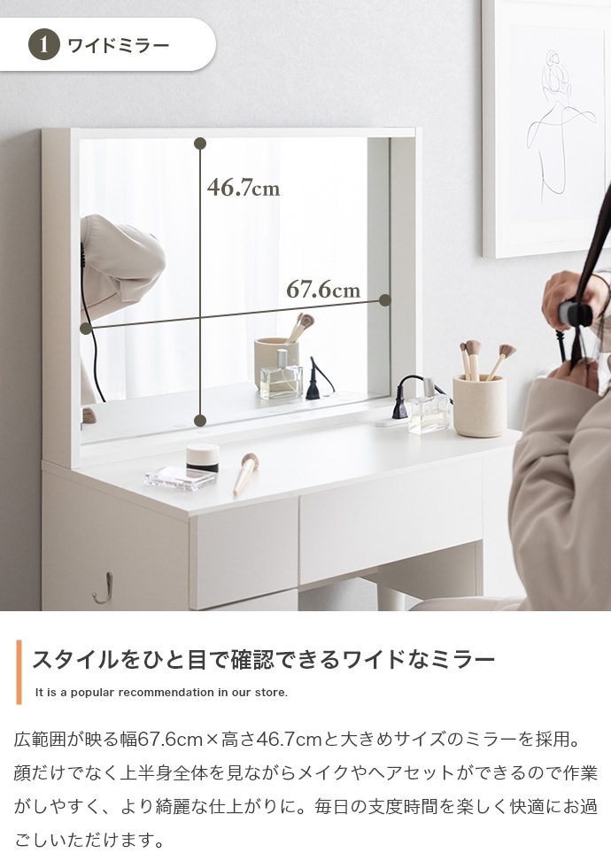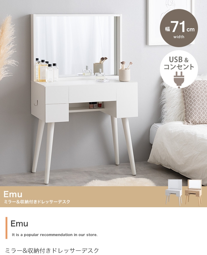 大きな鏡と広い作業スペースでのびのびメイクが叶う『Emu(エミュ)』ドレッサーデスク。 大容量の収納スペースでヘアセットやメイクアップを効率よく進めることができ、毎日の忙しい朝にもピッタリです。