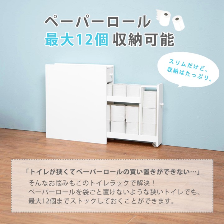 スリムなのにペーパーロールや掃除用品をたっぷり収納。幅14cmの省スペーストイレラック。 わずかな隙間にも収まるスリム設計ながら、トイレットペーパーや掃除道具をすっきり隠して収納し、トイレ空間を広く清潔に使えます。