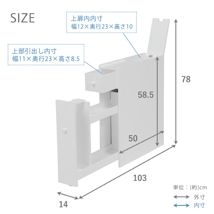 幅わずか14cmの省スペース設計。トイレのちょっとした隙間にぴったり収まり、デッドスペースを有効活用できます。