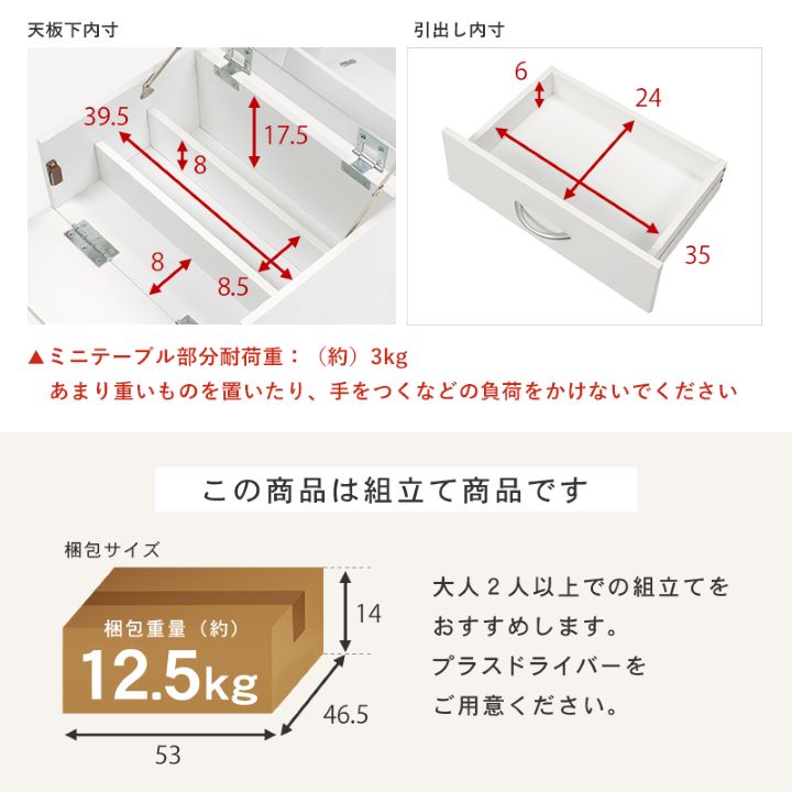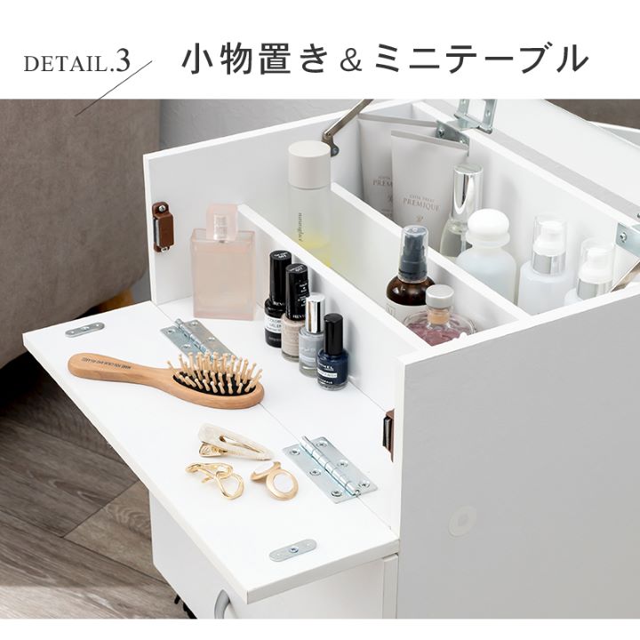 内側にワイドなミラーが付いているため、蓋を開ければドレッサーに早変わり。見やすい鏡でメイクも捗ります。