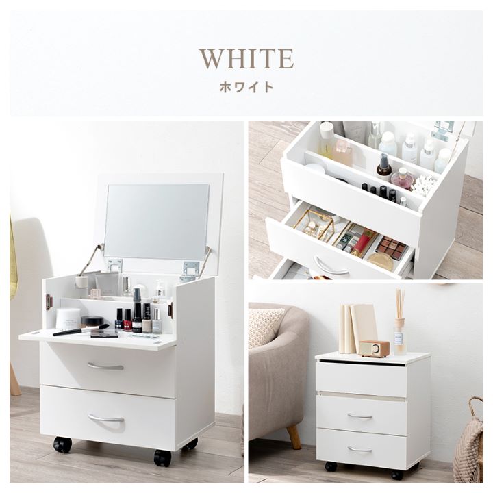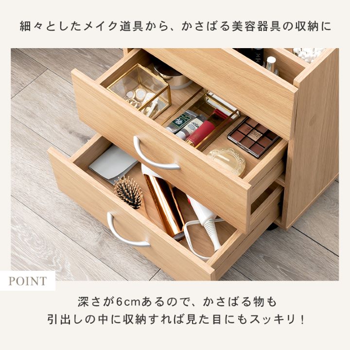 コンパクトなのに大容量。ワイドなミラーがドレッサーのようなコスメワゴン。 散らかりがちなメイク道具をまとめて収納でき、好きな場所でメイクができる便利なアイテムです。