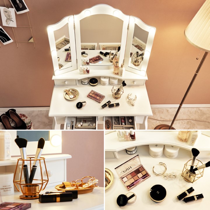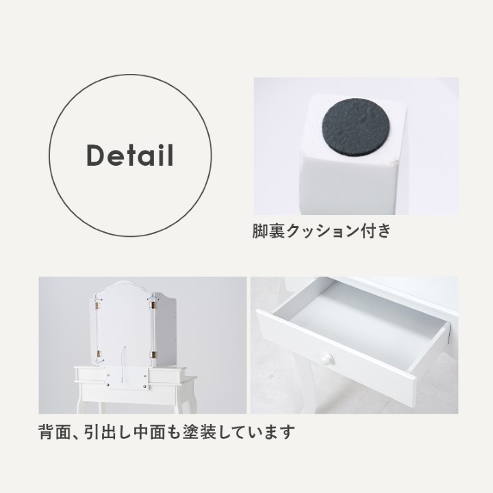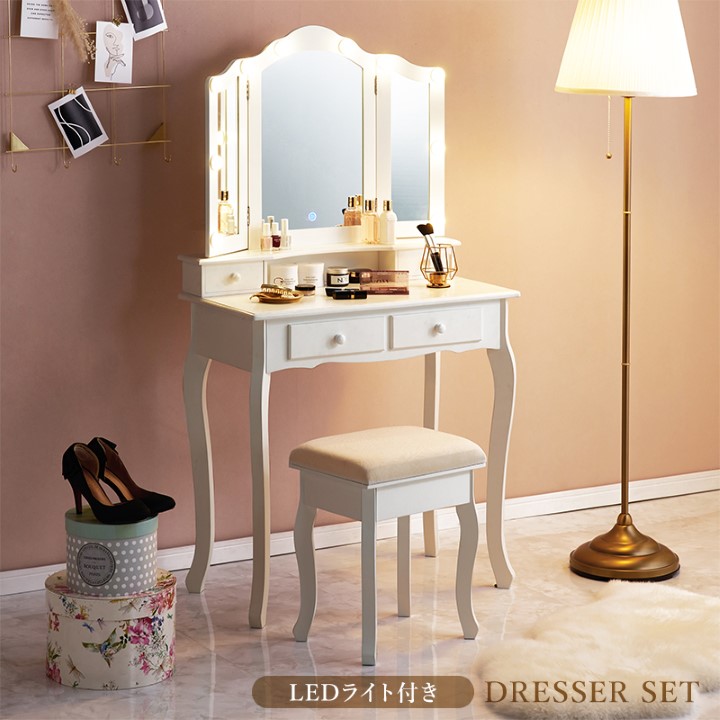 LEDの女優ライトで、ワンランク上のメイク時間を叶えるドレッサー。 多角的に確認できる三面鏡タイプで、メイクもヘアセットも完璧に。上品な曲線脚のデザインを合わせたスツールもセットになっています。