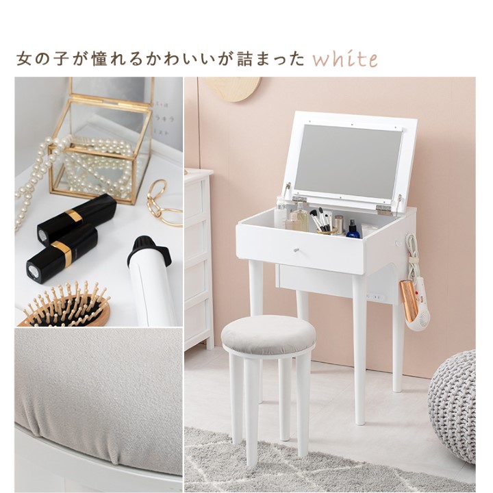 2口コンセントとスツールが付いた便利なドレッサーセット。 天板を閉じれば簡易デスクに早変わりする2WAY仕様で、メイクも作業もこれ1台で完結します。