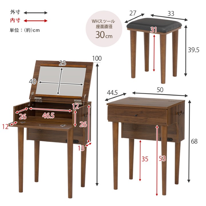 ドレッサー:(約)幅50 × 奥行61/44.5 × 高さ100/68cm