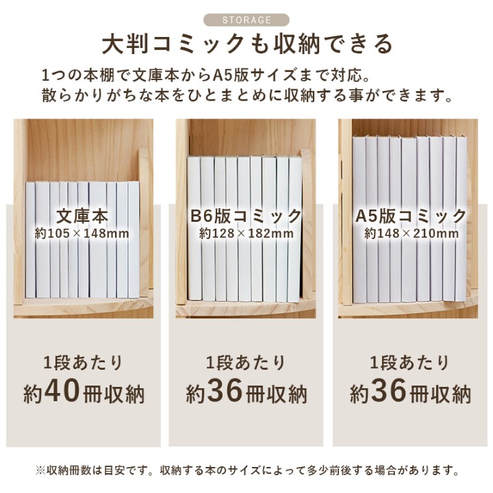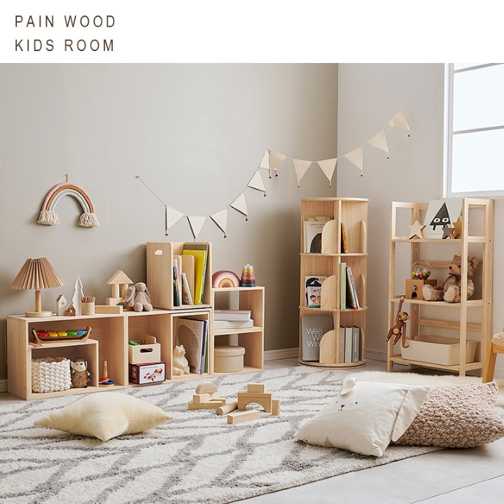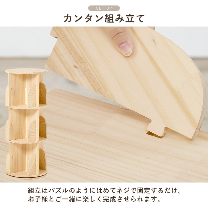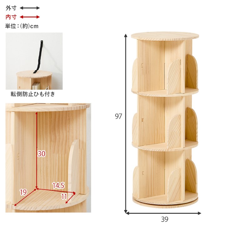 360度回転するので本が探しやすく、省スペースなのに大容量な丸回転ラック。 天然木パイン材の無塗装仕上げで、経年変化を楽しんだり、自分好みにDIYでアレンジすることも可能です。