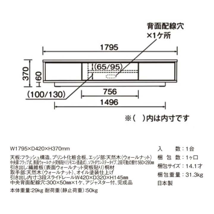 本体:幅179.5 × 奥行42 × 高さ37 cm