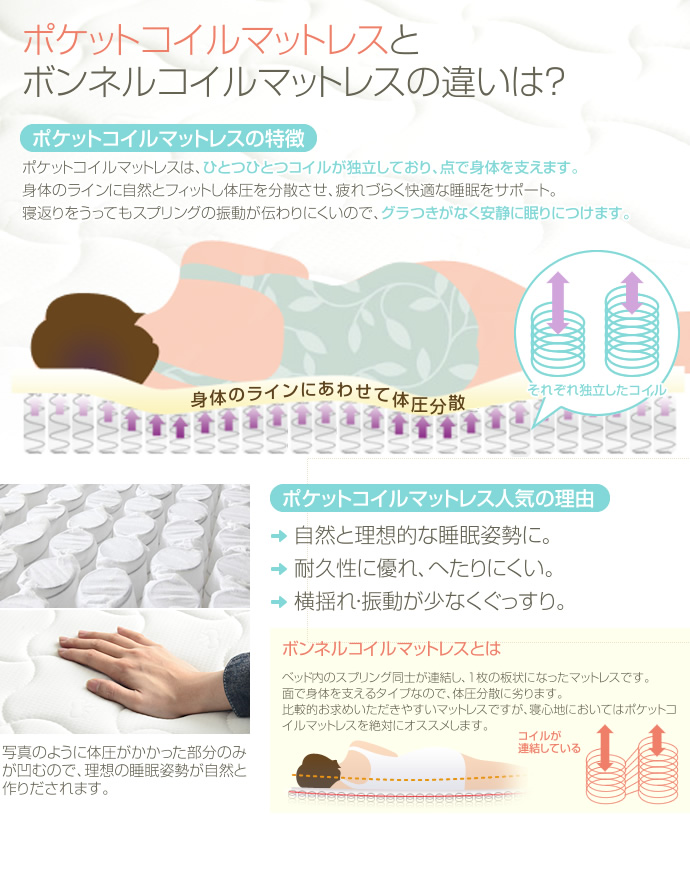 ◆ 優れた体圧分散と横揺れの少なさ 身体にかかる圧力を効果的に分散させるため、特定の場所に負担がかかりません。 また、振動が隣に伝わりにくい構造なので、二人で寝ていても相手の寝返りなどによる「横揺れ」が少なく、朝までぐっすりと眠れます。