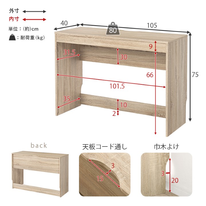 テーブル:(約)幅105 × 奥行40 × 高さ75cm