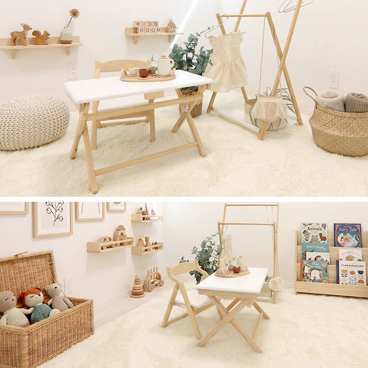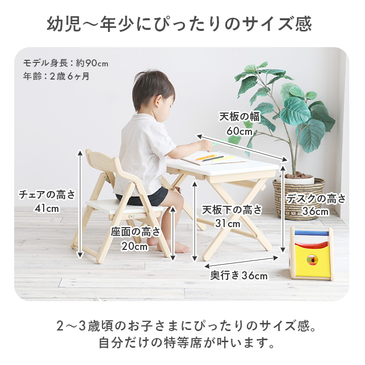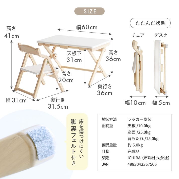 | サイズ | ■デスク 約 幅60×奥行36×高さ36cm(天板下の高さ31cm) ■チェア 約 幅31×奥行31.5×高さ41cm(座面の高さ20cm) |