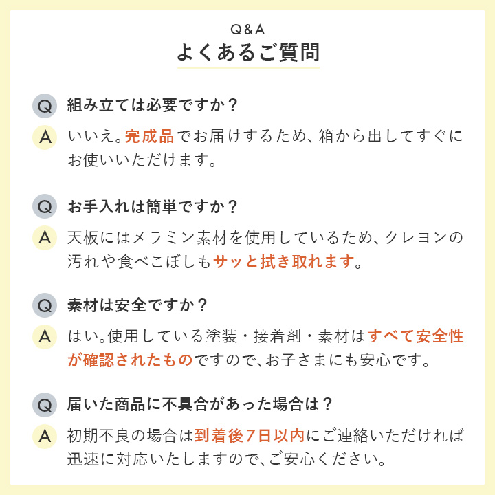 | 耐荷重 | ■デスク 天板約10kg ■チェア 座面約25kg、背もたれ約15kg |