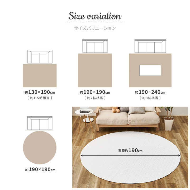 | サイズ | 幅130 × 奥行190cm(約1.5畳) 幅190 × 奥行190cm(約2畳) 幅190 × 奥行240cm(約3畳) 直径190cmラウンド(約2畳) |