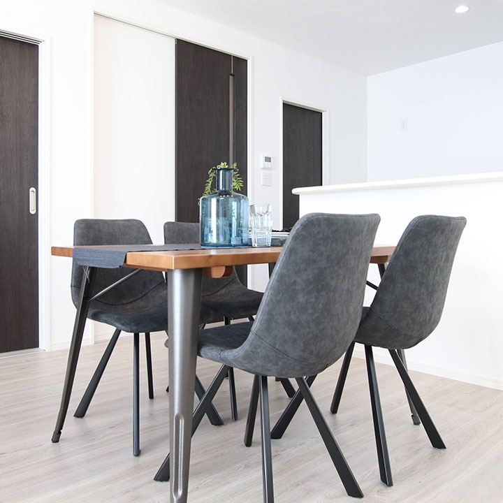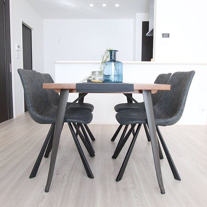 ・マットな質感の合成皮革に施されたステッチが、モダンで都会的なダイニング空間を演出します